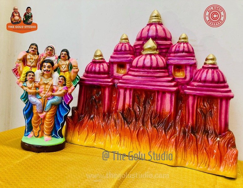 Description: Arakku Maaligai means "Wax Palace," a secret palace made of wax built by Duryodhana to kill the Pandavas by burning them alive. However, Bhima saved his family by carrying his mother and brothers on his shoulders through a secret tunnel arranged by Vidura. While Purochana and his family burned inside, Bhima's strength and quick thinking helped the Pandavas escape the fire safely. This story shows Bhima's courage and love for his family