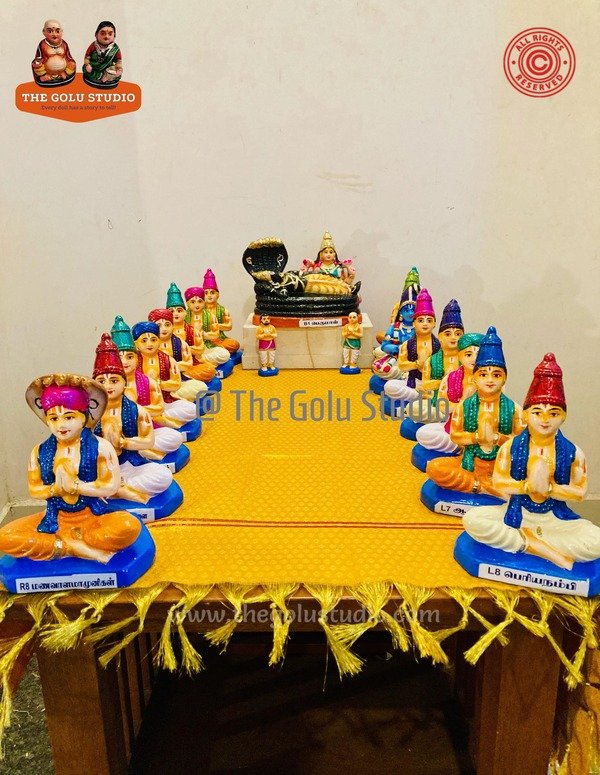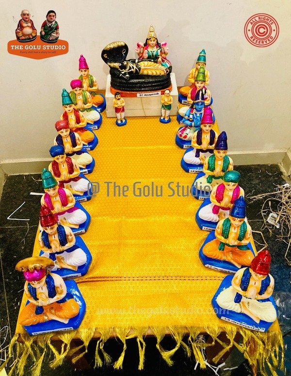 Guru Paramparai in Golu represents the unbroken line of saints who passed on spiritual knowledge and devotion. It shows respect for gurus who guide people on the path of truth and faith. Families display this set during Navaratri to honor tradition and seek blessings for wisdom. It teaches children gratitude, respect for elders, and the value of learning from teachers. Remembering Guru Paramparai inspires devotion, humility, and righteous living.