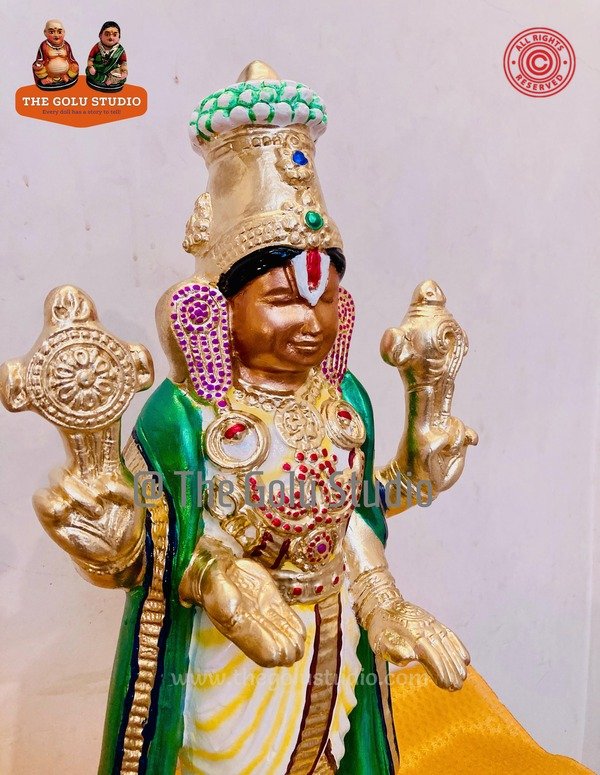 Description: Shri Sundaravalli Semdha with Shri Sundararaja Perumal, also known as Kallazhagar Serthi, is a divine scene celebrated in Madurai. It shows Lord Kallazhagar (a form of Vishnu) joining with his consort Sundaravalli Thayar. This event represents love, devotion, and the bond between the Lord and Goddess, blessing devotees with happiness and prosperity. Families display this set in Golu to honor their union and seek divine blessings. It teaches children about faith, respect, and the importance of togetherness. Remembering this serthi inspires devotion, harmony, and the belief that God always protects and guides his devotees with love.