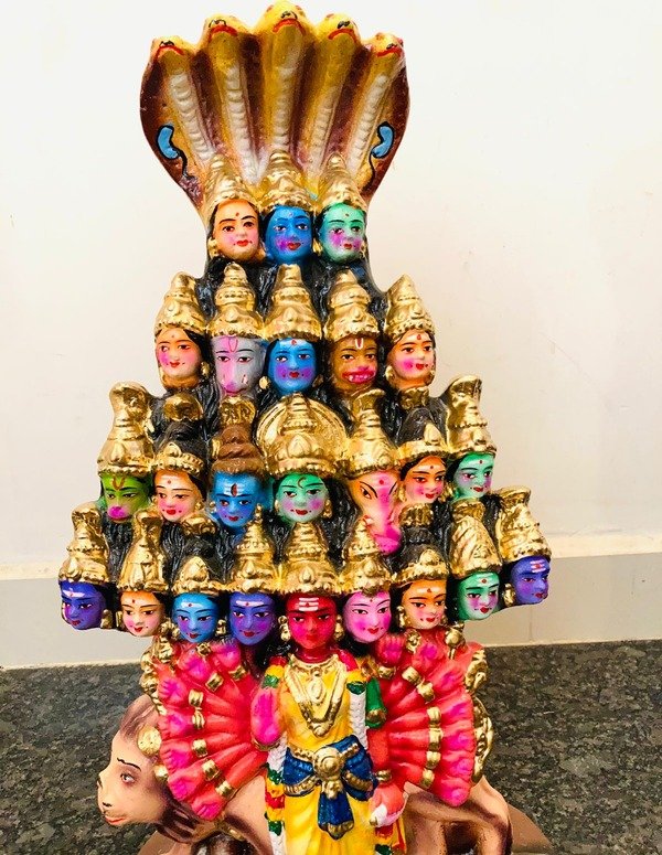 ChatGPT said: Navasakthi Vishwaroopan shows the nine powerful forms of the Goddess together, symbolizing strength, protection, and blessings. Each form represents a unique energy that helps devotees in different aspects of life, like health, wealth, courage, and wisdom. Families display this set in Golu during Navaratri to honor the divine feminine power. It teaches children about devotion, respect, and the strength of the Goddess, reminding everyone that her blessings bring harmony, prosperity, and well-being.