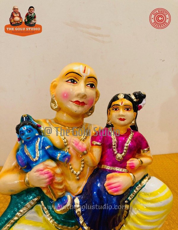 Description: Periyaazhwar is the foster father of Andal, the only female Alvar saint, who was found by him near a Tulasi plant in Srivilliputhur. He raised Andal with great devotion to Lord Vishnu, particularly Krishna. Andal is famous for her deep love and poems dedicated to Krishna, and she is considered his divine bride. Periyaazhwar’s own hymns often imagine the childhood of Krishna, expressing the tender care and joy of Yasoda, Krishna’s foster mother. The relationship between Periyaazhwar, Andal, and Krishna symbolizes divine love, devotion, and the spiritual bond between devotees and God.