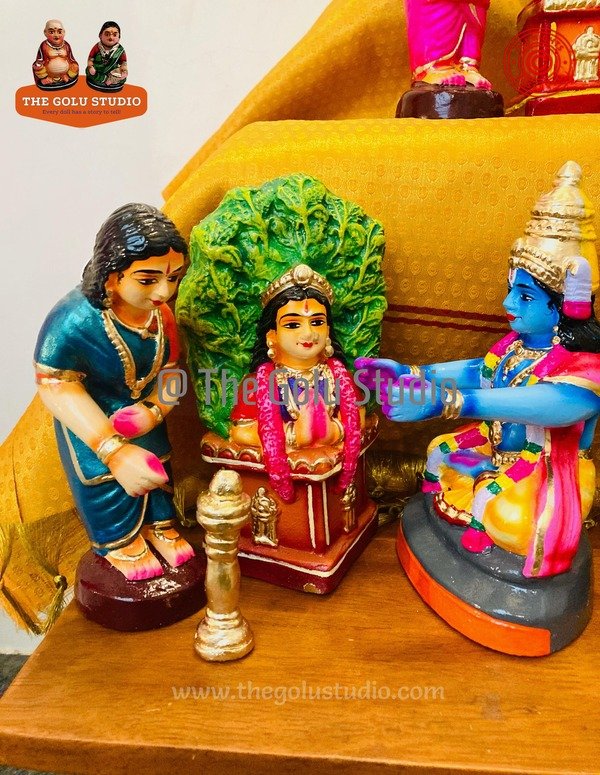 Thulasi Kalyanam with Krishna is a sacred ritual where Goddess Thulasi, considered holy and pure, is married to Lord Krishna. The story says Thulasi was once Vrinda, a devoted wife and great devotee of Lord Vishnu. Due to a curse, she became the Thulasi plant, blessed to be always dear to the Lord. Worshipping Thulasi brings purity, peace, and prosperity. Families celebrate Thulasi Kalyanam to show devotion, seek blessings for harmony, and honor the plant’s importance. It teaches children faith, respect for nature, and the power of sincere devotion.