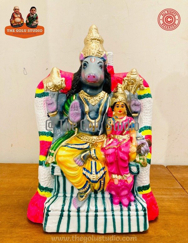 Description: Lakshmi Varahar is the divine form of Lord Vishnu as Varaha (boar) with Goddess Lakshmi. He incarnated to rescue Earth (Bhudevi) from demon Hiranyaksha by lifting her from the cosmic ocean. This form symbolizes protection, strength, and restoration. With Lakshmi by his side, Lakshmi Varahar blesses devotees with stability, prosperity, and relief from hardships. Worshipping this form helps overcome obstacles, gain courage, and stay rooted in dharma and righteousness.