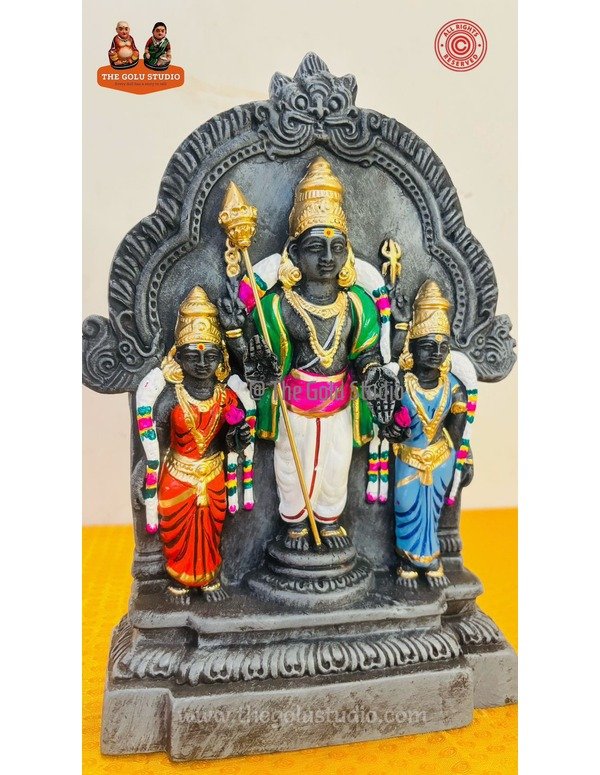 Description: Murugan is worshipped with his consorts Valli and Deivanai. Valli represents love and simplicity, while Deivanai represents discipline and duty. Together, they show balance in life. Devotees pray to them for courage, success, harmony, and blessings in family and spiritual life.